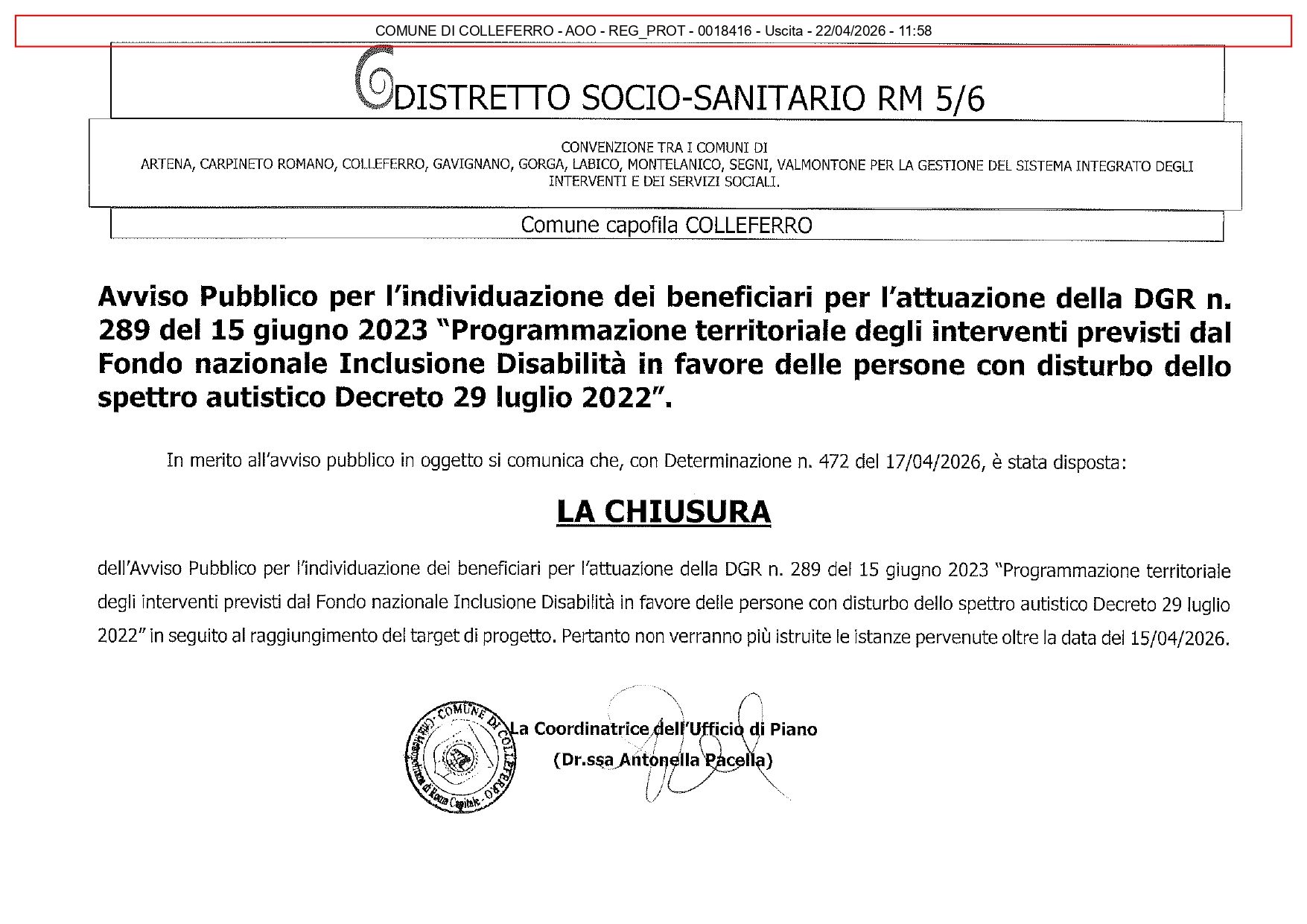 Con Determinazione n. 472 del 17/04/2026 è stata disposta la chiusura dell'Avviso Pubblico per l'individuazione di beneficiari per l'attuazione della DGR n. 289 del 15 giugno 2023 "Programmazione territoriale degli interventi previsti dal Fondo nazionale Inclusione Disabilità in favore delle persone con disturbo dello spettro autistico Decreto 29 luglio 2022"