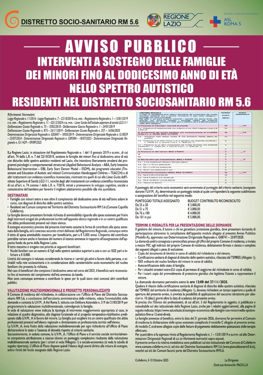 Per prendere visione dell'Avviso e scaricare la relativa modulistica è possibile consultare il seguente link https://pianodizonarm5-6.it/it/servizi/disabili-interventi-a-sostegno-delle-famiglie-dei-minori-fino-al-dodicesimo-anno-di-eta-nello-spettro-autistico-residenti-nel-distretto-sociosanitario-rm-5-6/disabili-interventi-a-sostegno-delle-famiglie-dei-minori-fino-al-dodicesimo-anno-di-eta-nello-spettro-autistico-residenti-nel-distretto-sociosanitario-rm-5-6