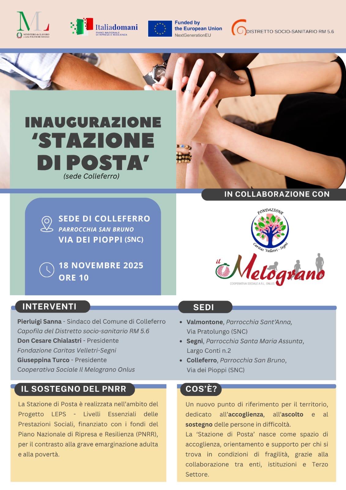 Il Comune di Colleferro, in qualità di Comune capofila del Distretto Sociosanitario RM 5.6 e la Cooperativa Sociale "lI Melograno", Vi invitano a partecipare all'Inaugurazione "Stazione di Posta" che si terrà martedì 18 novembre 2025 alle ore 10.00 a Colleferro presso la Parrocchia San Bruno, in Via dei Pioppi snc.