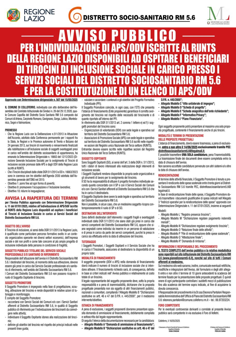 Riapertura avviso Pubblico per l'individuazione di APS/ODV iscritte al Runts della Regione Lazio disponibili ad ospitare i beneficiari di tirocini di inclusione sociale in carico presso i servizi sociali del Distretto Socio-sanitario RM 5.6 e per la Costituzione di un elenco di APS/ODV.